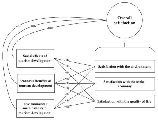 Considering the previously mentioned facts from the literature, the authors of the current study sought to assess the impact of three variations of rural tourism development on three perceived satisfaction domains. The hypothesized model consisted of six major constructs and 12 paths of hypotheses to explore the interactive relationships between the constructs. The main research hypotheses are mentioned below, and they were summarized in Figure 1.