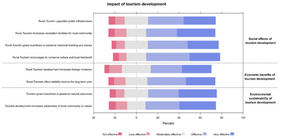 The greatest effects of tourism development (effective to highly effective responses) were reported for the impact of rural tourism on culture conservation and local handcraft (68.98%) and the influence of rural tourism on preserving the historical buildings and places (66.06%). Both of those items were relevant to the social effects. Interestingly, the highest perceived economic benefits were primarily related to offering stability income for long term plan (63.50%), whereas the highest perceived effects on the environmental sustainability was focused on the role of tourism development in increasing the awareness of the local community to the nature (65.69%, Figure 2).