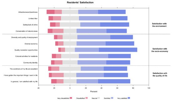 Regarding participant satisfaction, the majority of participants were satisfied with their environment (responding as satisfied or very satisfied) due to the conservation of natural areas (63.50%) and safety (61.68%). Furthermore, satisfaction with the socio-economy was heavily focused on the availability of quality recreation opportunities (78.83%) and the reliance on a diverse economy (72.99%). Interestingly, satisfaction of life was the highest perceived item in the participant’s quality of life domain (67.88%, Figure 3).