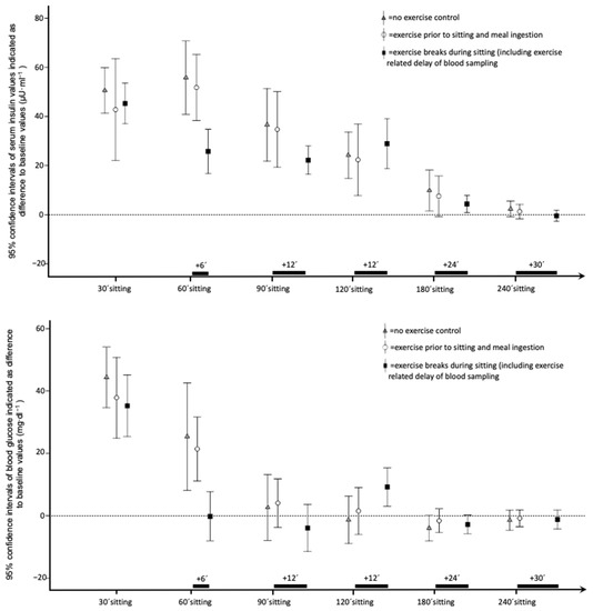 Figure 1. 95% confidence intervals of insulin and glucose blood values of all time points during interventions with 4 h of sitting and (1) no exercise, (2) 30 min exercise prior to sitting, or (3) 5 exercise breaks with matched overall duration (5 × 6 min). Insulin values are indicated as difference to individual baseline values in microunits pro milliliter (μU·mL−1). Glucose values are indicated as difference to individual baseline values in milligrams per deciliter (mg·dL−1). Timeframe in minutes starts with meal ingestion, and is indicated on the x-axis (’ = minutes).