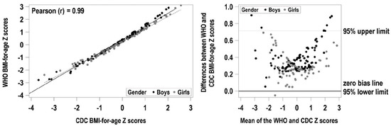 The associations among categorical variables were verified using the chi-square test. Pearson’s correlation coefficient was used to measure the statistical relationship between two continuous variables. Means between groups were compared using independent Student’s t-test for two-group comparisons or one-way ANOVA with post hoc Tukey’s honestly significant difference (HSD) for comparing more than two groups. Hochberg correction was used to avoid type 1 errors when all PA restrictions were compared at once. Bland–Altman analysis of the different BMI z-scores (CDC vs. WHO) showed that they were highly correlated, but with not negligible mean differences and measurement bias (Figure 1). These two measures of BMI were therefore analyzed as separate outcomes. Mixed linear modeling analyses were completed using SAS for Windows version 9.4 (SAS Institute Inc., Cary, NC, USA). Regression models were empirically tested to optimize the goodness of fit between the dependent and independent variables. The dependent variables of movement skill (locomotive, object, and total TGMD-2 scores), musculoskeletal fitness (handgrip and flexibility), MVPA and BMI z-score measurements were entered as outcomes in separate models. The independent variables, PA restrictions, CHD diagnosis and sex, were entered into each model as fixed effect predictors with age as a covariate.