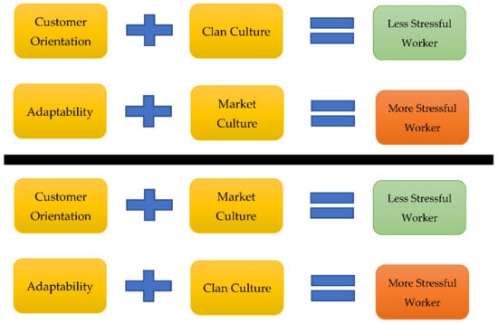 The present study also anticipates that employees in organizations with more incredible market culture tend to be less stressed than clan culture due to the greater mastery of customer orientation competency. Based on the findings of the past studies [1,2,63], market culture supports employee customer orientation competency, making the workers more competent to deal with workplace stressors. Besides, other scholars like Lagrosen and Lagrosen [64] argue that although employee customer orientation competency can increase the demand for corporate services and products, the practice also mitigates the stress that these demands create. Alternatively, customer orientation competency increases the demand without enhancing workplace stress due to increased control. Hence, the current researchers postulates that market corporate culture promotes greater customer orientation competency among employees, consequently reducing more work-related stress due to greater control of the business processes than within clan culture environment.
