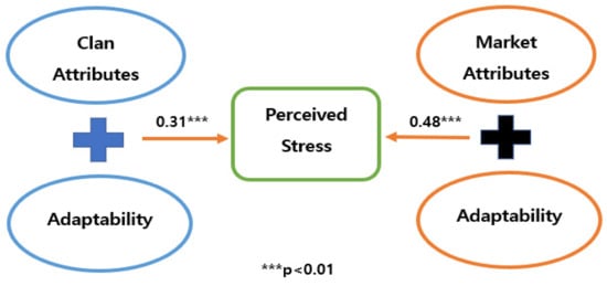 The present authors insist that to reduce the perceived work-related stress for workers, practitioners should consider an alignment of factors inside the firm to insure a work stress complimentary fit to those factors. This study contends that perceived stress management should be aligned with the organizational cultures and employee competencies. According to previous studies [1,2,63], employee adaptability competency is more matched with clan cultural attributes than market cultural attributes because the use of clan culture within an organization encourages knowledge creation and flexibility through employee development, promoting employee’s adaptability unlike market culture, which is suitable for simple and inflexible jobs within quite competitive circumstance. In addition, found to be conducive to creativity is the organizational encouragement inherent in a clan culture. Thus, organizations with influential clan culture promote employee adaptability competency and might reduce the prevalence of work-related stress among adaptable employees more than within market culture. Based on the findings of the past studies, the current researchers reasonably anticipate that clan culture is more reliable strategy to augment the employee’s adaptability competency and reduce their chances of experiencing workplace stress than market culture.