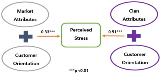 To identify the research model’s suitableness, this study used RMR, X2, RMSEA, GFI, indicating research model’s fitness. That suggests that the absolute fitness was measured by RMSEA, X2, GFI, RMR, and in terms of the incremental fitness, both TLI and CFI were checked by the current structural equation modeling [71]. Finally, our path analysis showed that employees who have a high degree of adaptability within clan culture attributes were less stressful than within market culture attributes. In contrast, the statistical results also showed that employees who possess a high degree of customer-orientation competency within clan organizational culture are more stressful than within clan organizational culture. According to the statistical findings, fortunately, the first and second hypotheses figured out in the expected directions and therefore, the present authors could accept them (See the Table 10, Figure 2 and Figure 3).