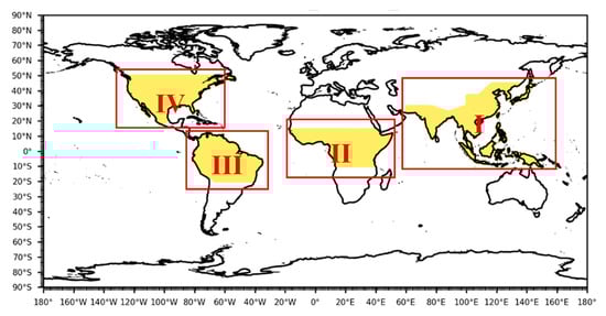 The global rice-producing region was selected as the study area for this paper. According to the United Nations Food and Agriculture Organization (FAO) statistical report, the world’s rice-producing regions are mainly concentrated in Asia, with nearly 90% of the world’s rice sowing area and 91% of the world’s rice output. South America (3.2%), Africa (2.9%), and North America (1.4%) represent additional rice sowing areas, and Central America, Europe, and Oceania together account for only 2.5% of the world’s rice sowing area, mainly in Australia. Combined with the sown area of rice, the world is divided into four major rice-producing regions, namely, the (I) Southeast Asia rice-producing region (SEA), (II) African rice-producing region (AF), (III) South American rice-producing region (SA), and (IV) North American rice-producing region (NA) (