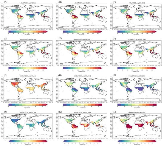 Figure 4), the number of warm days (Tx90p), total amount of extremely heavy precipitation (R99p), and 5-day maximum precipitation (Rx5day) were projected to increase in the future. The number of cold nights (Tn10p) showed a decreasing trend in the future.