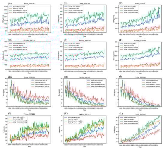 Figure 3), the number of warm days (Tx90p), total amount of extremely heavy precipitation (R99p), and maximum precipitation in 5 days (Rx5day) were significantly higher than those in the historical reference period and showed increasing trends in the future. The number of cold nights (Tn10p) was lower than that in the historical reference period, showing a decreasing trend.