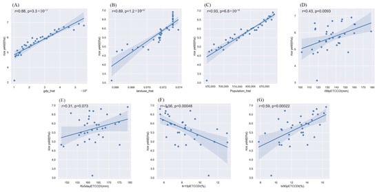 Figure 5 mainly shows the relationship between the historical rice yield and extreme climatic events and economic factors in the Southeast Asian rice-producing region (SEA). In this region, rice yield had a good linear relationship with the GDP, land use, and population. There was no significant linear relationship between the effects of climatic factors on the rice yield.