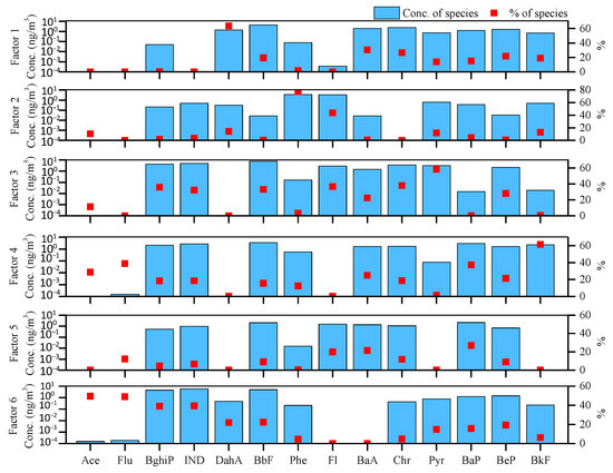 EPA PMF5.0 was run in a random seed model with different numbers of factors. The corresponding Q/Qexp was obtained and the decrease from five-factor to six-factor was the largest. Therefore, six sources were determined in terms of senior citizens’ exposure to PM2.5-bound PAHs in winter and the source profile is depicted in Figure 1.
