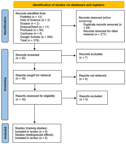 A database search was conducted in April and May 2021 based on PRISMA (Preferred Reporting Items for Systematic reviews and Meta-Analyses extension for Scoping Reviews—PRISMA-ScR) guidelines [8]. All studies were checked by two reviewers (M.K. and M.V.). Studies were searched in the following databases: PubMed, Web of Science, Scopus, ScienceDirect, ProQuest, Cochrane, and Google Scholar. The combination of keywords during the search process consisted of (“serial stretch loading” OR “serial stretch stimuli”) AND (strength OR power OR performance OR exercise OR resistance OR force OR rehabilitation OR muscle mass OR muscle damage) AND (leg press OR leg extension OR exercise device). Only original articles published in English or German (due to the originality of the review and proposed device) were retained. After the initial check, duplicate studies were removed based on the selection criteria, and the eligibility of the remaining studies was screened. Finally, the remaining studies were fully read and included in this review. In addition, the reference section of each article was also examined for potential missing articles that were not found in the database search. The chart representing the selection process is shown in Figure 2.