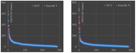 The rank-size analysis shows that there is a clear “head effect” on carbon emissions for urban households, with significant differences within the four regional groups. In terms of overall differences, the carbon emissions of households in 286 cities at prefecture level and above were ranked and smoothed, and it was found that there was a clear “head effect” in the carbon emissions of households in 286 cities, with the carbon emissions of households in the top 10% of cities significantly higher than those in the bottom 90% of cities (Figure 2). In terms of regional differences, between 2005 and 2015, the number of cities with urban households emitting more than 1 million tons of carbon fell from 23 to 12, and the Theil index of urban household carbon emissions expanded from 0.529 to 0.695, with the intra-group difference expanding from 0.485 to 0.685 and the inter-group difference narrowing from 0.045 to 0.010, revealing significant differences in urban household carbon emissions within China’s four major regions. Urban household carbon emissions differ significantly.