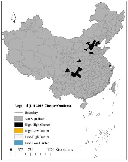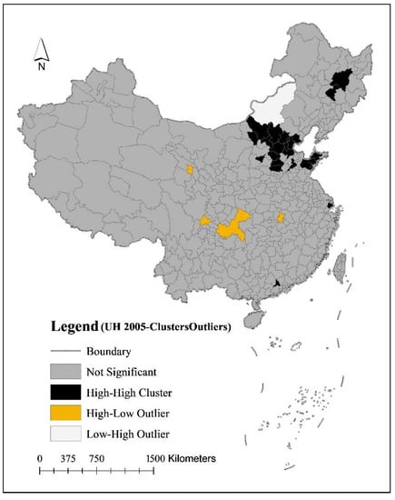 Local spatial autocorrelation analysis shows that in 2005, there were 22 cities with an HH cluster of urban household carbon emissions in China, including two in the northeast, 16 in the east, two in the central region, and two in the west; four cities with an HL cluster, including one in the central region and three in the west; and one city with an LH cluster, a city in Inner Mongolia in the west. However, China’s urban Household carbon emissions in 2015 were characterized by an HH cluster, with 13 cities in an HH cluster, including seven in the eastern region, two in the central region, and four in the western region (Table 2).