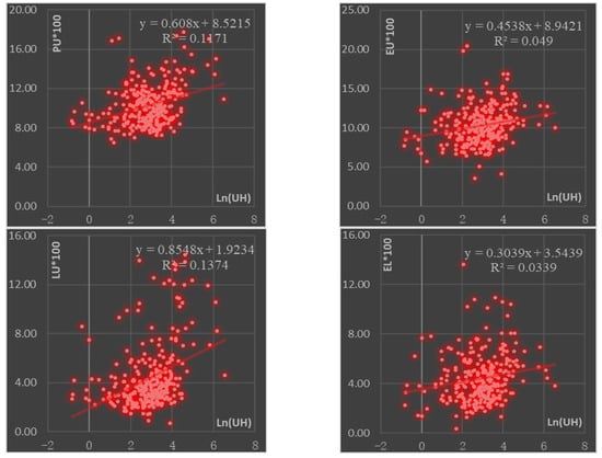 The spatial distribution of carbon emissions in China’s 286 cities at the prefecture-level and above shows that cities with high urban household carbon emissions also have higher overall urbanization scores. We plotted the scatter plots of population urbanization and urban household carbon emissions, economic urbanization and urban household carbon emissions, lifestyle urbanization and urban household carbon emissions, and landscape urbanization and urban household carbon emissions (Figure 5), and the results show that the four subsystems of urbanization are consistent with urban household carbon emissions in terms of direction.