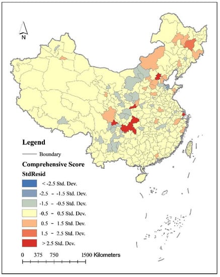 The geographically weighted regression model was used to measure Bandwidth, Residual Squares, Siga, AICc, R2, and R2 Adjusted values, which are 478,493.34, 88,012,839, 51.64, 3992.14, 0.28, and 0.20 respectively, where R2 Adjusted reveals in general terms the extent to which the factors of level of demographic urbanization, level of economic urbanization, level of lifestyle urbanization and level of territorial landscape urbanization explain the carbon emissions of household households, in this case, 20%, that’s the urbanization variables in this study explain 20% of the factors of carbon emissions of household households overall. The study used GIS software to symbolize the residuals of the GWR measurement processing (Figure 6).