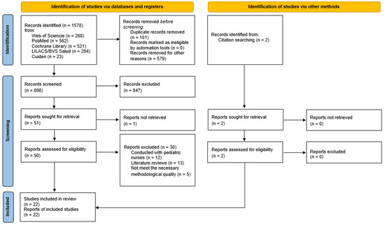 The total number of records obtained at the end of the literature search was (n = 1578), of which 22 were finally selected. The selection process can be seen in Figure 1, which was performed by two independent reviewers. The bibliographic search and the selection of documents are described in Figure 1. A total of 22 studies were chosen to be included in this review. Regarding the design of the studies that formed part of this systematic review, seventeen cross-sectional descriptive observational studies [26,27,28,29,30,31,32,33,34,35,36,37,38,39,40,41,42,43], one mixed-methods systematic review [44], one meta-analysis and systematic review [45], one scoping review [46], and one qualitative study [47] were identified.