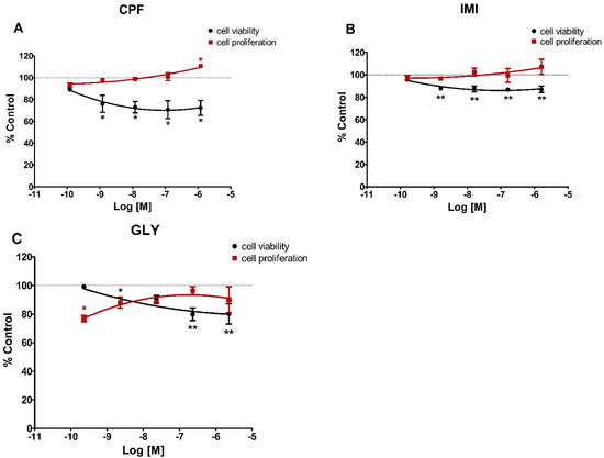 Dose-response curves for cell viability (black) and cell proliferation (red) assays in MCF-7 cells treated for 72 h with CPF (A), IMI (B) or GLY (C). Values are means ± SEM of three independent experiments with control cells set at 100%. Asterisks indicate statistically significant differences with respect to control cells: * p < 0.05; ** p < 0.01.