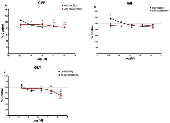 Dose-response curves for cell viability (black) and cell proliferation (red) assays in MCF-12A cells treated for 72 h with CPF (A), IMI (B) or GLY (C). Values are means ± SEM of three independent experiments with control cells set at 100%. Asterisks indicate statistically significant differences with respect to control cells: * p < 0.05; ** p < 0.01; *** p < 0.001.