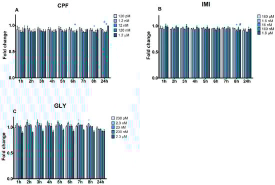 Apoptotic signals evaluated by Annexin V assay in MCF-12A cells treated with CPF (A), IMI (B) and GLY (C) or medium alone as a control for 24 h. Data are mean fold change values of three independent experiments. Asterisks and hashtags indicate statistically significant differences with respect to control cells: * p < 0.05; # p < 0.01.