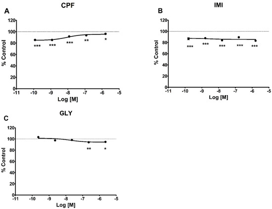 ATP levels in MCF-7 cells treated for 72 h with CPF, (A) IMI (B) or GLY (C). Values are means ± SEM of three independent experiments with control cells set at 100%. Asterisks indicate statistically significant differences with respect to control cells: * p < 0.05; ** p < 0.01; *** p < 0.001.
