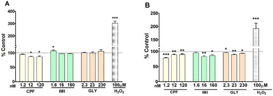 Intracellular ROS production in MCF-7 cells (A) and MCF-12A cells (B) treated with CPF, IMI, GLY or H2O2 as a positive control. Values are means ± SEM of three independent experiments with control cells set at 100%. Asterisks indicate statistically significant differences with respect to control cells: * p < 0.05; ** p < 0.01; *** p < 0.001.