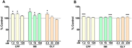 In MCF-12A (Figure 2), cell viability was decreased only by CPF at the two highest doses of (120 nM and 1.2 µM), whereas IMI at 160 pM induced a significant increase of cell vitality. Conversely, cell proliferation was significantly reduced by CPF at all tested concentrations, by IMI at the highest dose (1.6 µM) and by GLY at the higher doses (23 nM, 230 nM and 2.3 µM).