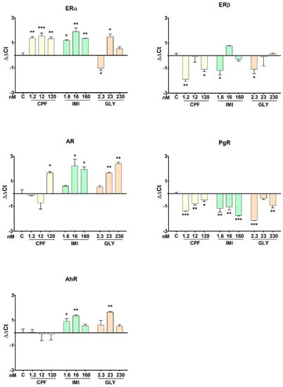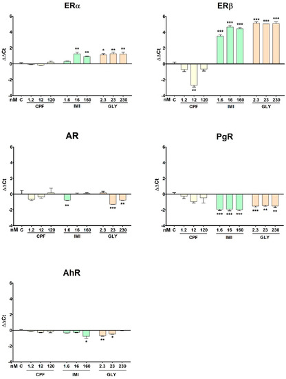 The gene expression levels of the selected NRs (i.e., ERα, ERβ, AR, AhR and PgR) in MCF-7 cells are shown in Figure 7. ERα gene expression was significantly up-regulated by CPF and IMI at all tested concentrations and by GLY at the intermediate concentration (23 nM). Conversely, GLY at 2.3 nM significantly down-regulated ERα expression. ERβ gene expression was repressed by CPF at the lowest and highest doses (1.2 and 120 nM) and by IMI and GLY at the lowest doses (1.6 nM and 2.3 nM, respectively).