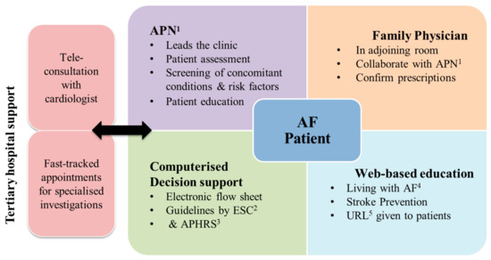 Woo, B.F.Y.; Tam, W.W.S.; Rangpa, T.; Liau, W.F.; Nathania, J.; Lim, T.W. A Nurse-Led Integrated Chronic Care E-Enhanced Atrial Fibrillation (NICE-AF) Clinic in the Community: A Preliminary Evaluation. Int. J. Environ. Res. Public Health 2022, 19, 4467. https://doi.org/10.3390/ijerph19084467