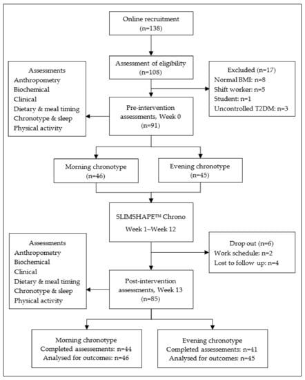 The sample size for the feasibility study was determined using GPower version 3.1. The calculation sample size was based on an F-test, with the f effect size calculated based on mean and standard deviation weight change from Muñoz et al. (2019) [26], with an alpha level of 0.05 and a test power of 80%, resulting in 88 participants. After considering 20% for possible losses (based on a 3-month drop-out rate in Muñoz et al. (2019)), a total of 105 participants were required. Figure 1 describes the flowchart of the SLIMSHAPE™ Chrono. The recruitment process started in August 2019–September 2019. The information about the weight reduction program was spread via online, posters, email and social media among the Putrajaya community. A total of 138 potential participants registered; however, only 108 turned up for the screening assessments. The final analysis included 91 participants. Seventeen participants were excluded because of normal BMI (n = 8), being shift workers (n = 5), on postgraduate study leave (n = 1) and uncontrolled diabetes mellitus type 2 (n = 3).