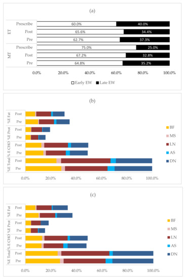 Pre–post differences in temporal patterns of energy and macronutrient intake based on early and late window. (a) The distribution of % E intake during pre- and post-intervention according to morning and evening chronotypes. (b) The distribution of % E from CHO, protein and fat based on early (breakfast, morning snack and lunch) and late (afternoon snack and dinner) windows in MT. (c) The distribution of % E from CHO, protein and fat based on early (breakfast, morning snack and lunch) and late (afternoon snack and dinner) windows in ET. Detailed statistical values described in Supplementary Table S2a,b. Abbreviations: E, energy; CHO, carbohydrate; prot, protein; MT, morning chronotype; ET, evening chronotype; EW, eating window; % E, percentage energy; BF, breakfast; MS, morning snack; LN, lunch; AS, afternoon snack; DN, dinner.