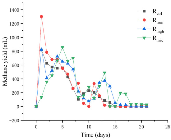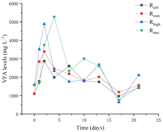 In general, the accumulation of VFA in all the reactors matched the variations in the methane production (Figure 2). The first methane production peak in Rctrl, Riron, and Rhigh occurred one day before the cumulative peak of VFA, and the first methane production peak in Rmix occurred the day after the cumulative VFA peak. At the same time, the changing trend of VFA in all the reactors was roughly the same, first increasing and then decreasing gradually. Specifically, in Rctrl without pretreatment, the VFA level was 1101.30 mg·L−1 at the beginning of the reaction. After pretreatment, the initial VFA levels of Rhigh and Rmix reached 1586.76 mg·L−1. Studies have shown that when the VFA levels in the reactor exceeds 1500.00 mg·L−1, the operation of the reactor will be affected [33]. At the beginning of the experiment, the VFA levels of Rctrl increased rapidly and reached the highest value of 2867.30 mg·L−1 the next day. Subsequently, it decreased gradually until 1432.52 mg·L−1 at the end of the reaction. In contrast, the VFA levels of Riron reached a peak of 3393.93 mg·l−1 the next day, which was 1.2 times that of Rctrl. One study showed that the addition of iron powder can promote an abundance of hydrogen- and acetic acid-producing bacteria, resulting in an increase in VFA levels, until the end of the experiment when the VFA levels decreased to 1564.64 mg·L−1, indicating that the biological enhancement effect of adding iron powder promoted the growth of acetoclastic methanogens and consumed the VFA accumulated in the reactor [34].