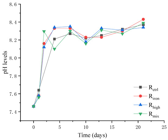 The changing trends of pH in all the reactors were the same; pH continued to rise from the beginning of the reaction (Figure 3), but was maintained in the optimal range of anaerobic digestion (6.5–8.5) [35]. This may be because ammonia is an important nitrogen source for the pH-stabilizing agent in the neutralization of VFA. At the beginning of the experiment, with the increase in VFA levels, the ammonia levels also continued to rise and stabilize. At the same time, when iron powder was added into the anaerobic digestion reactor, it reacted with the water and organic matter, resulting in an increase in the pH. This shows that the effect of iron powder and ammonia nitrogen on the pH were greater than VFA, and the anaerobic digestion system itself had a regulating effect. So, the pH was relatively stable in the anaerobic digestion process.