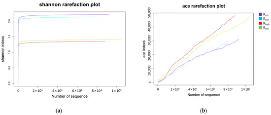 Alpha diversity based on the Shannon and Ace indexes at different experimental conditions. (a) Shannon rarefaction plot; (b) ace rarefaction plot.