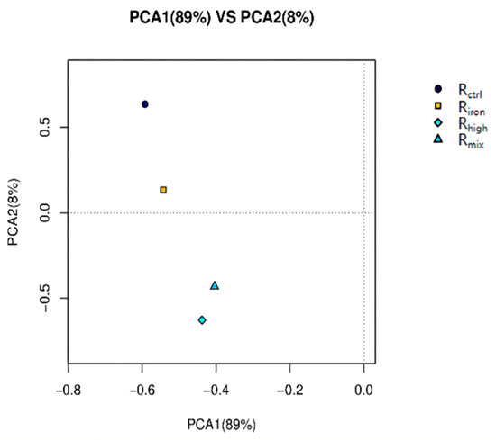 Beta diversity based on the principal component analysis showed a clear archaeal community dynamicity between the different conditions of the experiment (Figure 6). Samples from Rctrl and Riron tended to cluster together, suggesting that Rctrl and Riron shared similar methanogen communities; that is, the addition of iron powder resulted in the smallest change to the archaeal community. The archaeal communities of Rmix and Rhigh were more similar, showing that high-temperature thermal hydrolysis changed the archaeal community more than the addition of iron powder, and played a dominant role among the two pretreatment methods.