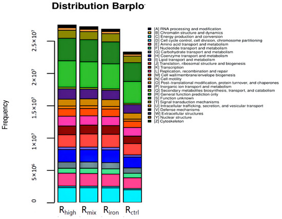 Figure 9 shows the functional abundance histogram. The higher the histogram, the greater the functional richness of the archaeal community. The total functional abundance of archaeal communities in the four reactors could be arranged in decreasing order as Rhigh, Rmix, Riron and Rctrl, which was the same as the law of cumulative methane production. Among them, the order of carbohydrate transport and metabolism, as well as lipid transport and metabolism, could be arranged in decreasing order as Riron, Rmix, Rctrl and Rhigh, while the order of amino acid transport and metabolism in decreasing order was Rhigh, Rmix, Rctrl, and Riron. This shows that adding iron powder will reduce the carbohydrate transport and metabolism, as well as lipid transport and metabolism by archaeal community, but will increase the amino acid transport and metabolism. HTHP, however, had the opposite effect. Studies have shown that the functional abundance of amino acid metabolism, carbohydrate metabolism, and lipid metabolism can be improved, which is conducive to enhancing the degradation of macromolecular organics and increasing the cumulative methane production [41].