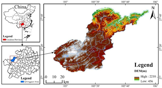The study area is located in Qixingguan District, Bijie City, Guizhou Province (104°52′–105°56′ E, 27°03′–27°46′ N), a central city at the junction of Sichuan, Yunnan and Qian in the northern part of the Yunnan–Guizhou Plateau, covering an area of about 3412 km2 (Figure 1). The limestone karst landform types, such as peaks, water caves, and dissolved depressions are widely distributed in the area. The terrain is high in the west and low in the east, with a step-like descent from southwest to northeast and an altitude difference of 1754 m. It belongs to the subtropical humid monsoon climate type, with no severe cold in winter and summer heat, the average annual temperature is about 13.6 °C, the average annual relative humidity is about 80.8%, the average annual precipitation is about 1126.9 mm, and the average annual sunshine hours are 1178 h. Soil types are dominated by limestone, loam, and yellow-brown loam [23]. The unique topographic features and hydrological processes cause weak structural stability of the ecosystem, forming a typical ecologically fragile karst area susceptible to disturbance and with poor resilience.
