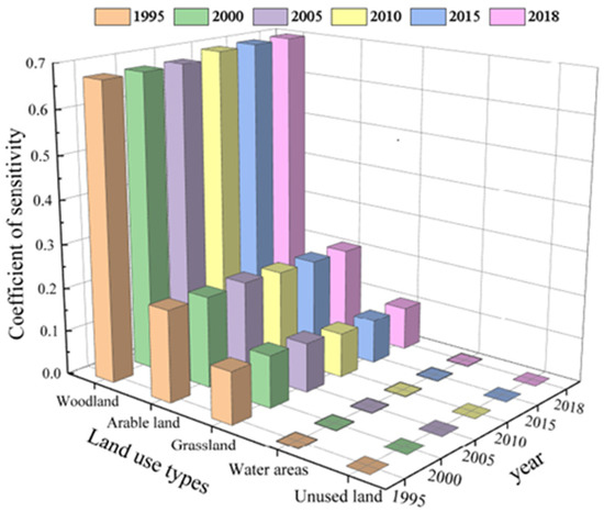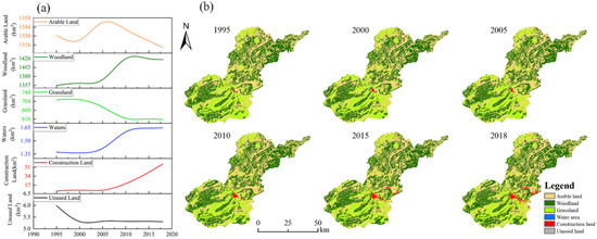 From 1995–2018, arable land, woodland, and grassland were the dominant landscape types in the study area, spatially, with woodland, waters, and construction land areas showing an increasing trend (Figure 3).