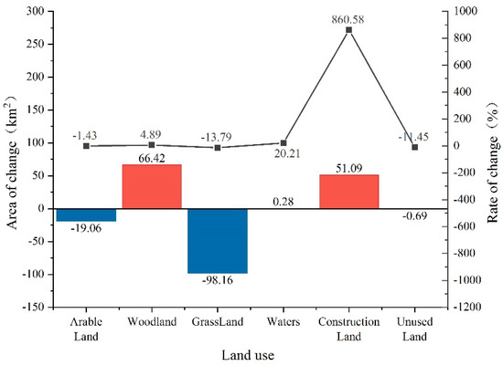 During the study period, the area of forest land, construction land, and water land types increased significantly (Figure 4), and the change rate was construction land > water surface > forest land; the area of grassland, cropland, and unused land decreased significantly, and the change rate was grassland > unused land > cropland.