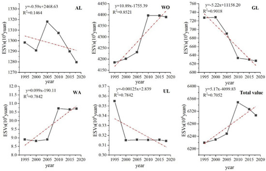 Under the influence of the overall landscape type shift, as shown in (Figure 6), the change of ecosystem service value varies among different landscape types. The value of cropland fluctuates most sharply, showing a “decrease–increase–decrease” trend, with ESVs decreasing by 7.36 × 106 yuan before 2000, increasing by 27.09 × 106 yuan in the next 5 years, and decreasing by 38.32 × 106 yuan after 2005, for a cumulative decrease in total ESVs of 18.59 × 106 yuan. The change trend of increasing ESVs was similar for woodland and watershed, but from 2010 to 2018 woodland ESVs decreased by 7.14 × 106 yuan and watershed remained largely unchanged, with woodland and watershed ESVs increasing by 211.36 × 106 yuan and 1.8 × 106 yuan, respectively, during the study period. Grassland ESVs showed a continuous decreasing trend with a cumulative decrease in ESVs of 100.3 × 106 yuan. The decrease in ESVs of unused land maintained a stable state until 2000, with a decrease of 0.04 × 106 yuan.