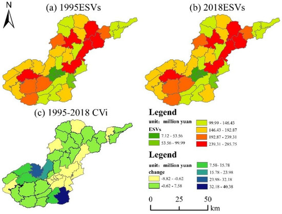 Spatial distributions of ESVs in the study area in 1995 (a) and 2018 (b) and the spatial distribution of CVi (c) in the study area during 1995–2018.