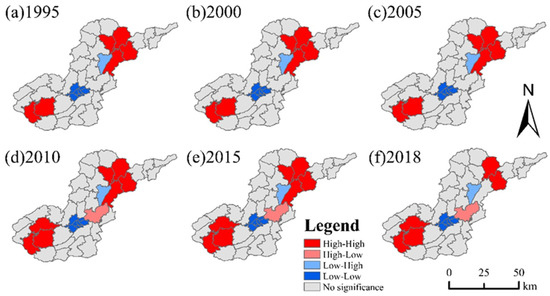 LISA distribution map of the ESVs in the study area in 1995 (a), 2000 (b), 2005 (c), 2010 (d), 2015 (e), and 2018 (f).