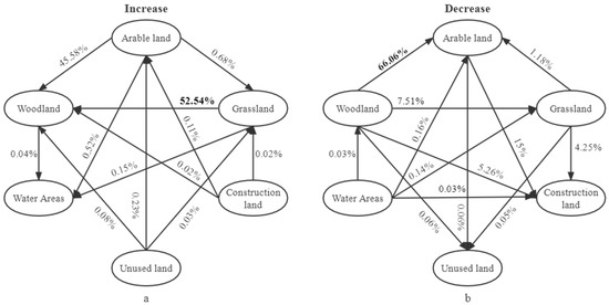 Contribution rate of different land use transfer types to the increase (a); and decrease (b) of ecosystem service value.