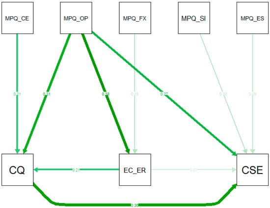 We started our analyses with a model featuring the total scale scores, without subdimensions. Model 1 thus features the scores on the five MPQ scales (i.e., CE, FX, SI, ES and OM), as well as the total scores on EC-ER, CQ, and CSE. As such, Model 1 aims to test all hypotheses (H1 to H6) at a structural path level, without subscales. Model 1 converged after 40 iterations, using maximum likelihood as means of estimation. Model 1 is a fully saturated model, meaning that all variances, covariances, and means of the observed variables are perfectly reproduced. The chi-square test on the saturated model renders χ2 (N = 842, 0) = 0. Our set of selected fit indices also renders perfect fitting values, which are inherent to saturated models: RMSEA = 0, SRMR = 0 and CFI = 1. Table 2 shows all regressions within Model 1. Model 1 also rendered an explained variance of R2 = 0.17 for EC-ER, R2 = 0.30 for CQ and R2 = 0.39 for CSE. Although the model is saturated and thus inherently has the best possible fit indices, the model still harbors non-significant pathways. These pathways have to be removed in Model 2 in order to evaluate the present study’s hypotheses.