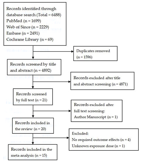 Figure 1 shows the flowchart of study selection. The initial keyword search identified 6488 records, including 1699 from PubMed, 2229 from Web of Since, 2491 from Embase, and 69 from Cochrane Library. After the removal of duplicate records, 4892 unique titles and abstracts were assessed, and 4871 records were further excluded. The full texts of the remaining 21 articles were reviewed, 20 met the inclusion criteria (one author manuscript excluded). Among the 20 studies that met the review inclusion criteria, 5 studies were further excluded due to inconsistency with the intended required outcome effects [24,37,38,39], and unavailability exposure dose [8]. A total of 15 studies were finally included in the meta-analysis [20,21,22,23,26,34,40,41,42,43,44,45,46,47,48].