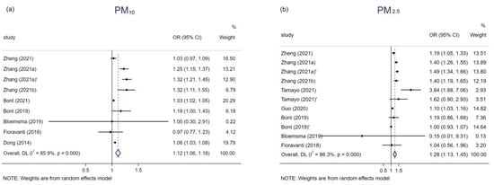 In this review, a random-effects model was used to assess the combined effects and the 95% CIs by incorporating RRs/ORs/HRs for binary outcome (obesity) and β for continuous outcome (BMI) from initial studies [28]. Since the definition of pollutant concentration increments varied across studies, we defined 10 μg/m3 as the standard increment; other reported units were converted (formulas: NO2: 1 ppb = 46/22.4 μg/m3; NOx: 1 ppb = 46/22.4 μg/m3; O3: 1 ppb = 48/22.4 μg/m3). Based on the assumption of a linear relationship between air pollution and obesity or BMI, the following equations were used to standardize the estimates of effects across studies [28,33]: