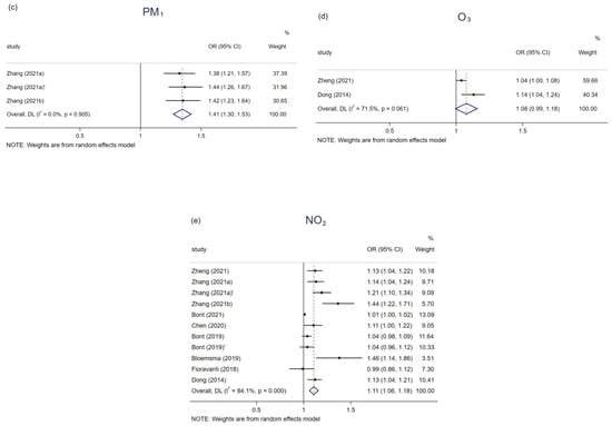 Associations of PM10 (a), PM2.5 (b), PM1 (c), O3 (d), and NO2 (e) with obesity in children and adolescents.