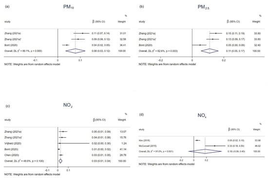 For the outcome of BMI status, heterogeneity was found among all the pollutants (PM10: I2 = 89.1, p < 0.001; PM2.5: I2 = 82.6, p = 0.003; NO2: I2 = 48.6, p = 0.0100; NOx: I2 = 91.0, p < 0.001), Funnel plots (Supplementary Figure S2) and an Egger’s test showed publication bias only existed in research that related to PM10 (PM10: p = 0.018; PM2.5: p = 0.131; NO2: p = 0.156; NOX: N/A).