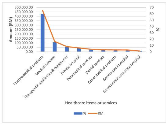 Total monthly household expenditures in HES 2014/2015 were recorded at MYR 48,932,560.16, while the total monthly OOP payments for healthcare were recorded at MYR 784,255.94, with an average of MYR 54.18 per household. Households’ OOP payments were mostly spent on purchases of pharmaceuticals, at MYR 467,679.58 (59.6%), followed by outpatient medical services at MYR 116,386.11 (14.8%), therapeutic appliances and equipment at MYR 57,990.27 (7.4%), private hospitals at MYR 42,935.42 (5.5%), paramedical services at MYR 27,788.56 (3.5%), dental services at MYR 22,134.24 (2.8%), other medical products at MYR 20,720.04 (2.6%), government hospitals at MYR 20,095.72 (2.6%) and government corporate hospitals at MYR 8526.00 (1.1%) (Figure 2). In terms of OOP payments for groups of healthcare services or items, it was the highest for pharmaceuticals (59.6%) with a mean of MYR 32.00, while hospital-based services represented the least OOP expenditure (9.1%) with a mean of only MYR 4.68. Spending for outpatient-based services and medical products, appliances and equipment was 21.2% (with a mean of MYR 11.34) and 10.0% (with a mean of MYR 5.41), respectively.