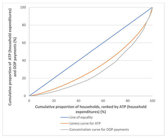 - The concentration curve for OOP payments, LH(r), plots the cumulative percentage of OOP payments against the cumulative percentage of the households, ranked by ATP. Two indexes can be derived from the Lorenz curve, (Lx(r), and the concentration curve for OOP payments, LH(r), which is the Gini coefficient for ATP, Gx, and the concentration index for OOP payments, Ch for the latter. The Gx is twice the area between the Lx(r) and the line of equality, in which Gx ranges from 0 to +1, where a value of +1 implies a case of perfect inequality in the distribution of ATP, while a value of 0 implies perfect equality in the ATP distribution. As for Ch, it is twice the area between the LH(r) and the line of equality. The Ch ranges from −1 to +1, where a value of −1 implies that the poorest household contributes all OOP payments and a value of +1 is where all OOP payments are made by the richest household. A negative Ch value is when the LH(r) lies above the line of equality, which implies that OOP payments are more concentrated among the poorer household, while a positive value is when the LH(r) lies below the line of equality, which implies that OOP payments are more concentrated among the richer household [6,7].