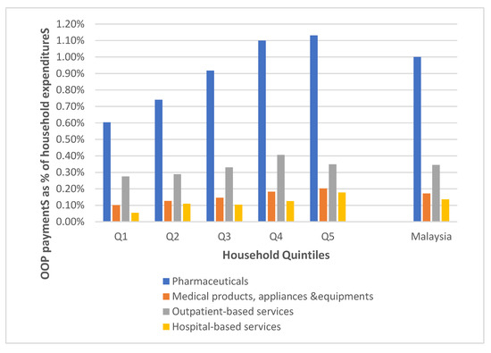 For the purpose of analysis, households’ ATP was ranked according to their respective total household expenditures. The households were ranked and classified into five quintiles of ATP, from the poorest 20% to the richest 20% (Q1 to Q5). Both variables (household OOP payments and ATP) in this study were valued according to the local currency, the Malaysian ringgit (RM). MYR 1.00 is equivalent to USD 0.24, based on the current exchange rate set by the Central Bank of Malaysia [18].