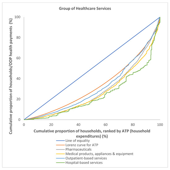 The OOP payments for healthcare were most concentrated among the richer households in the hospital-based services group with the highest concentration index of 0.5142, followed by medical products and appliances (0.4578) and pharmaceuticals (0.4311). In general, the OOP payments were found to be progressive for all groups of healthcare services, as the concentration curves for all groups of healthcare services lay under the Lorenz curve for ATP (Figure 5) and all groups had a positive value for KPI. However, the concentration curve for outpatient-based services was noted to cross the Lorenz curve just after the second half of Q4, leveled proportionately with the Lorenz curve for ATP. The concentration curves for OOP payments made for hospital-based services lay below the Lorenz curve for ATP and were the farthest, as compared to other group of healthcare services (Figure 5). This indicate that hospital-based services were the most progressive and concentrated among the richer households, particularly among the richest 20%, Q5. It is evident from the calculated KPI (Table 4) as hospital-based services had the highest KPI of 0.1756, followed by medical products and appliances (0.1192) and pharmaceuticals (0.0925). The least progressive group was the purchase of outpatient-based services, with a KPI of 0.0394.
